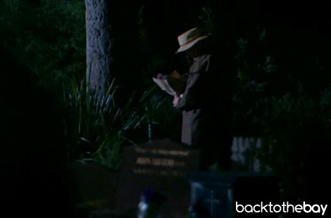 Robertson is still questioning Nicole over the sequins when Alf arrives and insists Robertson leaves. Alf is very concerned at the effect the investigation is having on his loved ones. Robertson decides to question Colleen, who revels in being of assistance to the police. He asks her about Leah, and about the allegations that Penn left the needle on the beach. She tells Robertson that Penn confessed everything to her, including setting her up for theft. She also informs him about Penn lending Angelo the money for his restaurant. Robertson then asks Miles and Alf to come to the Surf Club for a chat. Miles is adamant Robertson won’t get the better of him but he’s stumped when Robertson asks what he knows about Alf and Tulip O’Hare. Robertson also asks about the vigilante meeting, asking Miles who was there – he confirms it was Alf, Sid and Angelo. Alf joins them and the two deny any knowledge of Tulip – but Robertson knows they’re lying, and warns them he’ll be digging deeper to prove it. Later, Robertson and Graves stake out Tulip’s grave and Alf shows up to pay his respects. His actions are caught on camera and it looks like Roberson has Alf exactly where he wants him.
