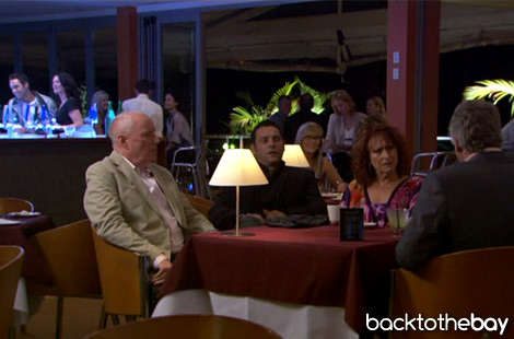 Joanna invites Irene for dinner and she’s a little reluctant, but Joanna talks her into it as payment for her hospitality. Irene see more of the real Joanna on their dinner, and it’s clear Joanna hasn’t won her over. The bucks party turn up at the same restaurant and Joanna takes Vittorio off to buy him a drink. At the bar, Joanna and Vittorio are disparaging about the locals who are trying to befriend them, mocking their small town ways. Later in the evening Irene tells Alf she’s glad she came out – now she understands entirely why April and Bianca travelled to the other side of the world to get away from her.