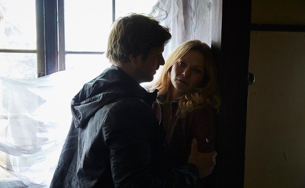 At the shack Ash, hides in the bushes, but Gunno’s spotted him and takes him by surprise, putting a gun to his back and forcing him inside. Ash tries to fight Gunno, but he is overpowered, and Gunno knocks him out and ties him up. For a moment Gunno softens, seeing that Virginia is terrified and takes her in his arms, reassuring her. Virginia plays along, as Gunno says there’s enough money for them to get started, but then he finds the phone, and realises they’ve been tracked. He smashes the phone in anger ad rushes outside, yelling at Virginia to bring the baby. While they’re distracted, Ash has regained consciousness and is quietly trying to free himself, rubbing his hands raw against the restraints. As Virginia heads out, Ash shouts after her. She slows, but she’s too scared to disobey Gunno.