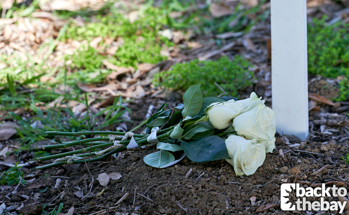 A third unmarked white cross is placed, and Leah places a bunch of white roses as Justin and Tori watch on in reflection.