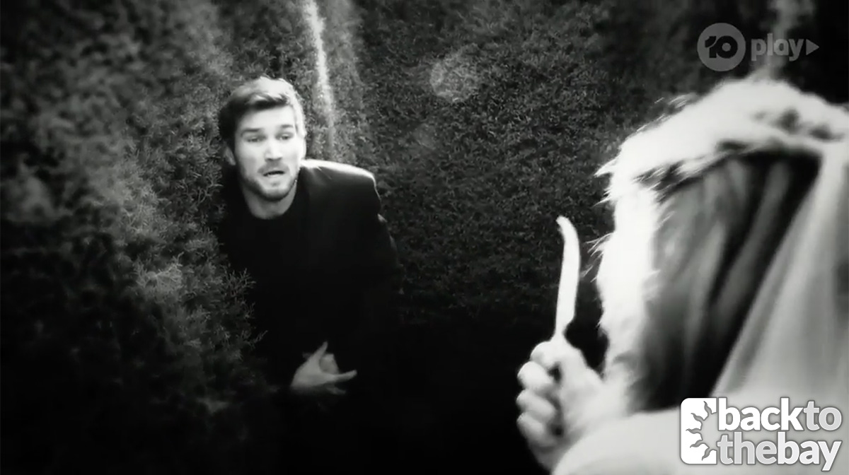 Back at the maze, Ned is taken back to the night where she stabbed him, and has horrific flashbacks of the terrible event. It was last October that Scarlet, dressed in a wedding dress and devastated that they had broken up, told him that he’d left her with no choice before going on to stab him in the abdomen with a cheese knife. The event left him with PTSD, so being back in the same situation a year ago fills him with dread, and perhaps a certain amount of anger.