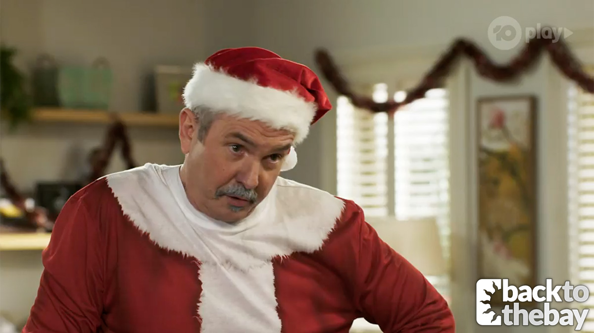Across the street, everyone else is getting ready, with Sheila dressing as Mrs Claus. She plans to make a grand entrance, corner Clive, and shimmy him under the mistletoe before planting one on him.