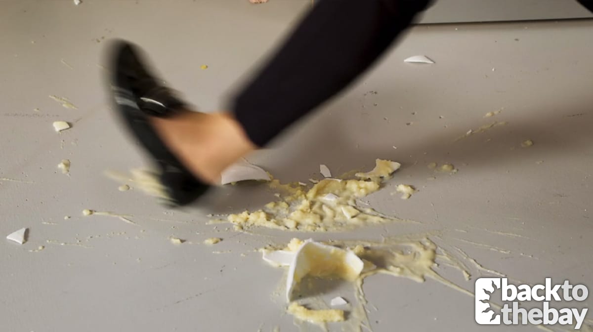 He unleashes, throwing his soufflé dish at Brent. It misses and smashes all over the ground. As Brent labels him a psycho, Jane enters to find out what all the commotion is about. However, her heel catches on the soufflé strewn across the floor and she goes sliding.