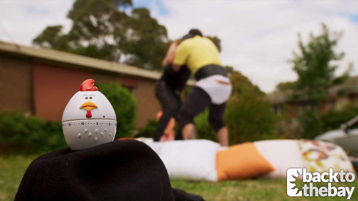 The next day, Shane organises a way to battle it out over the egg timer. With Nell (Scarlett Anderson) in on it, she leads her father out to the front of the house, where Shane has pulled a mattress.