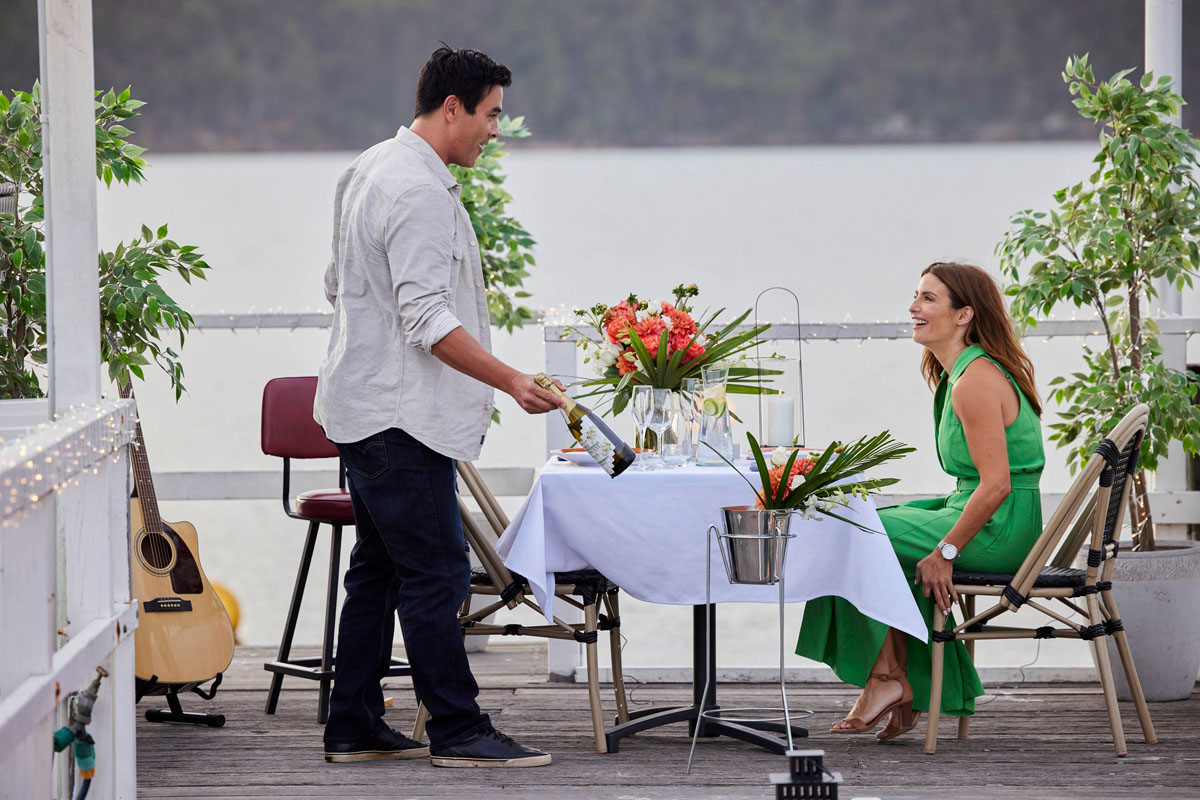 Over at the Pier Diner complex, Leah and Justin start to put the second part of the plan in place – a candle-lit dinner on the pier at sunset, with fireworks set to go off as Justin serenades them with his trusty guitar.