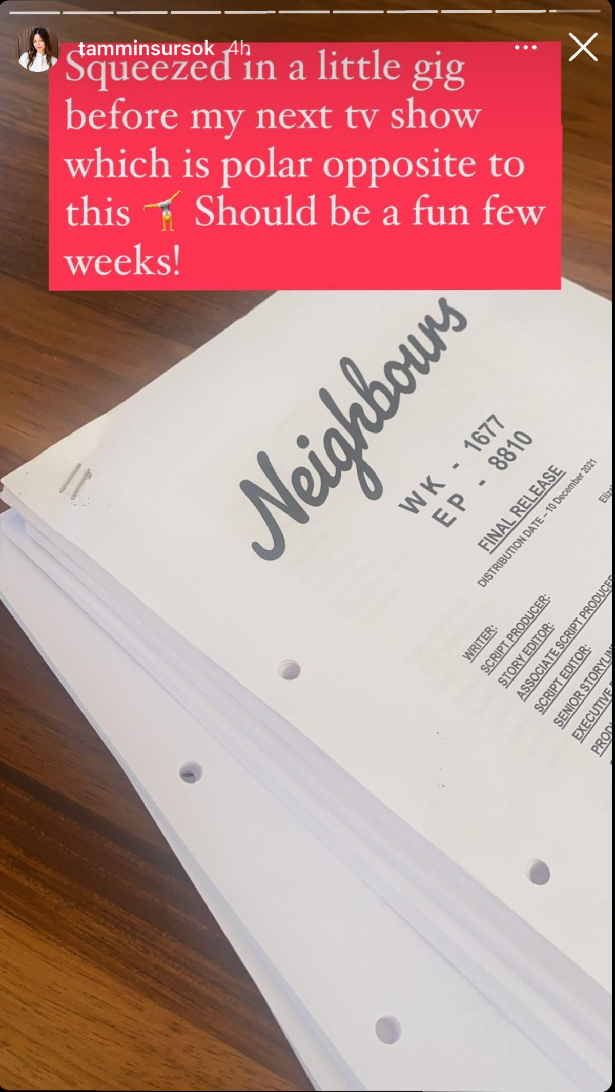 Announcing the news of her role on her Instagram Stories, Tammin (@tamminsursok) posted a picture of her Neighbours scripts, with the caption “Squeezed in a little gig before my next tv show which is the polar opposite of this. Should be a fun few weeks!”