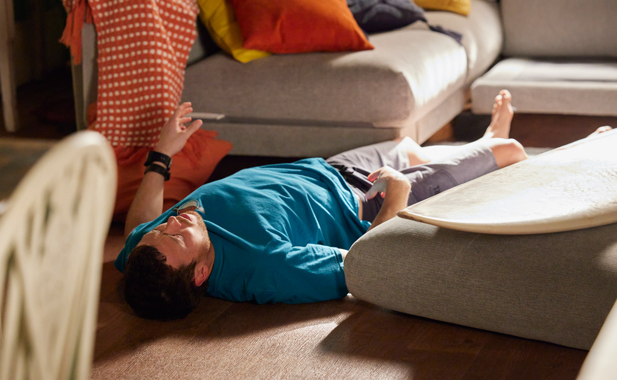Heading home, Dean sets up his surf board on a large footstool in the living room.