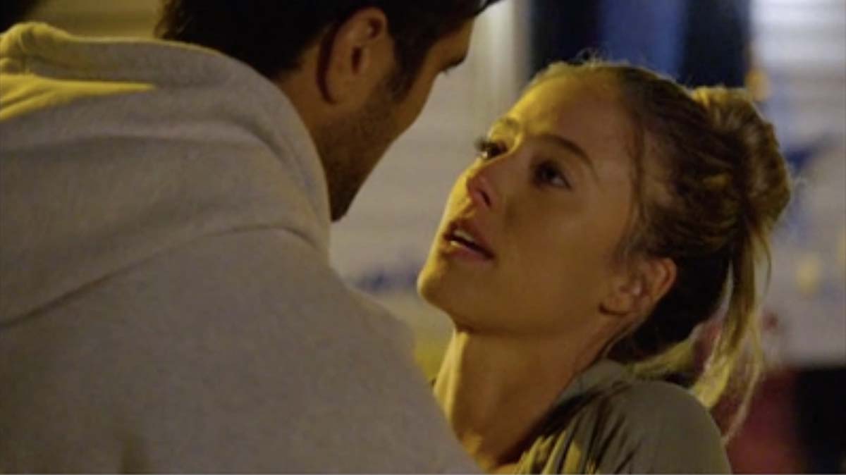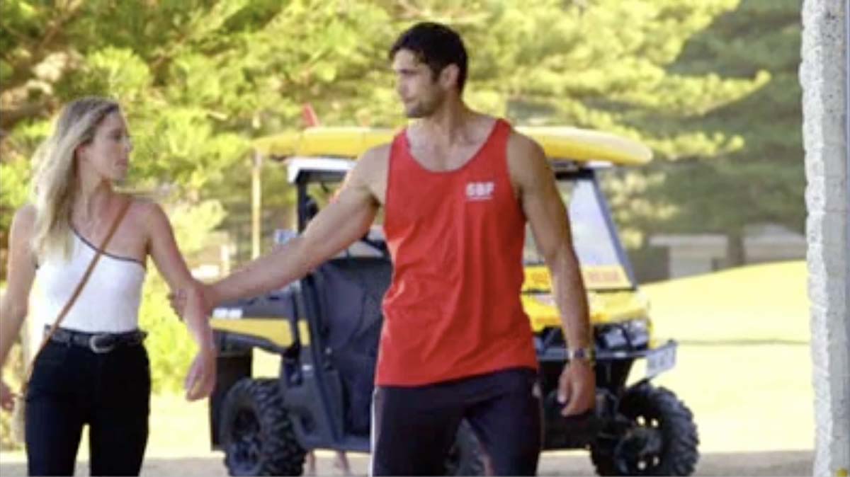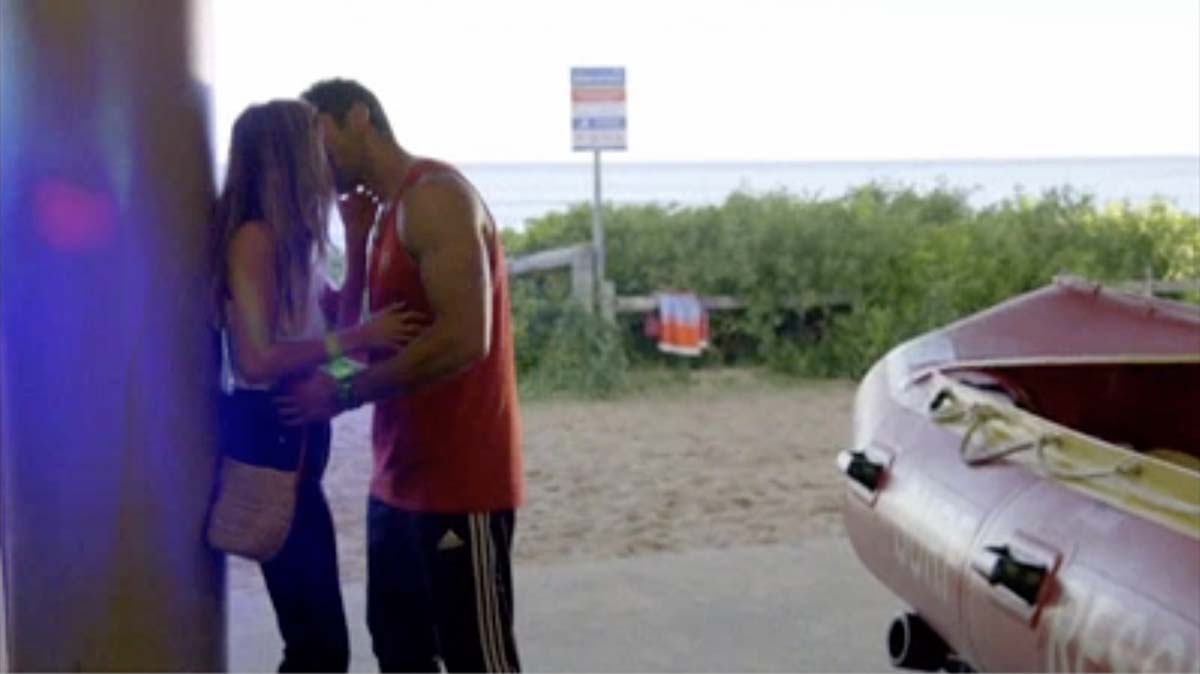 As they walk towards the Surf Club entrance – seemingly on their way to their respective jobs – Tane grabs Flick and pulls her against the wall, where he kisses her passionately.
