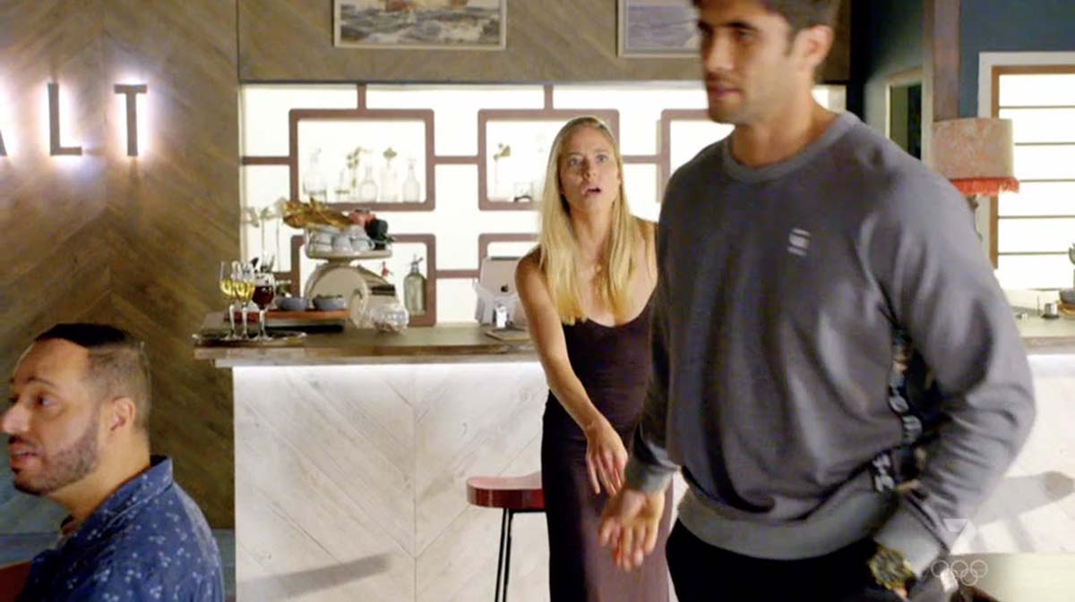 “I get it, we’re keeping our distance,” she says reluctantly – from what appears to be behind the bar at Salt. It looks like a new job at the bar could be a distraction from everything else happening in her life.