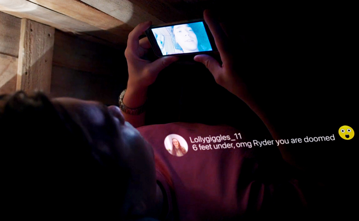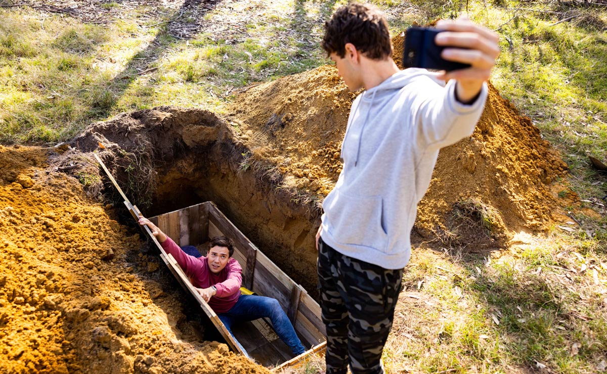 When Ryder spots a coffin brochure in his step-grandmother Martha’s (Belinda Giblin) hospital room, it gives him a crazy idea, and he suggests to Theo that he could be buried alive! Theo thinks Ryder is crazy, but Ryder points out how much money they could make, particularly if they charge a fee for viewing the livestream.