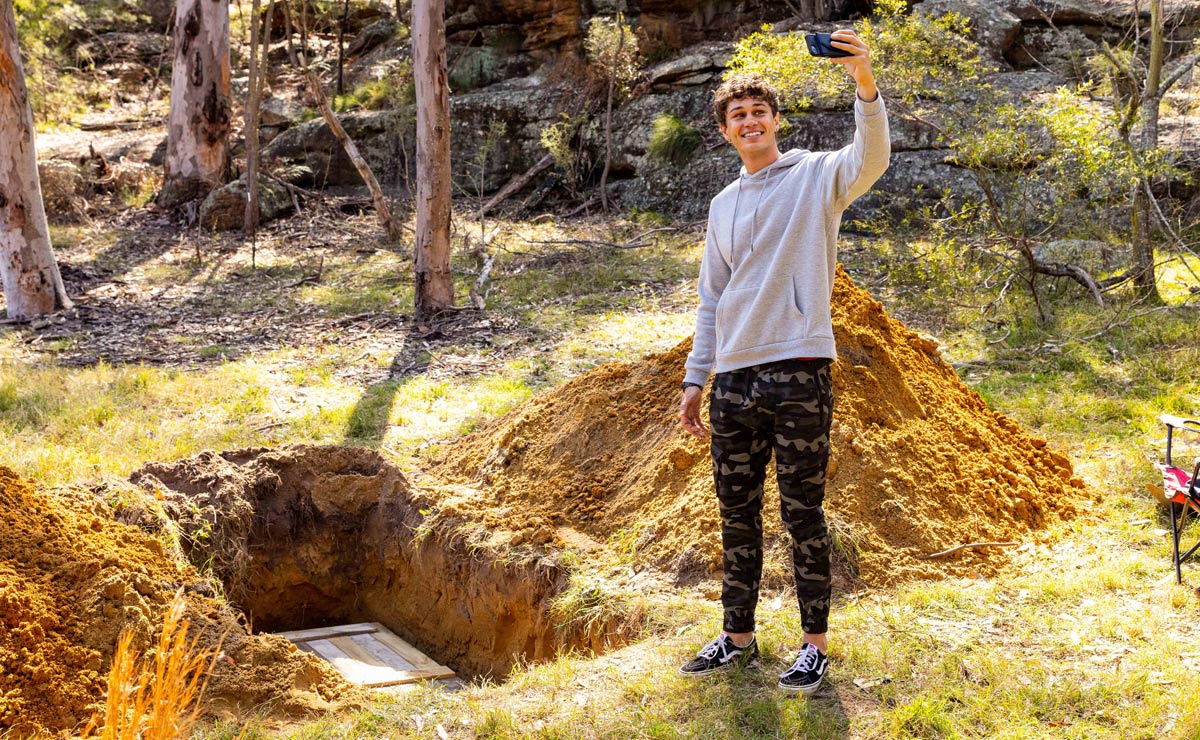 The next day, not wanting to be interrupted as they were with the firewalking challenge, the two scope out a remote spot in bushland near the caravan park, where Theo brings along the rudimentary coffin he has built.
