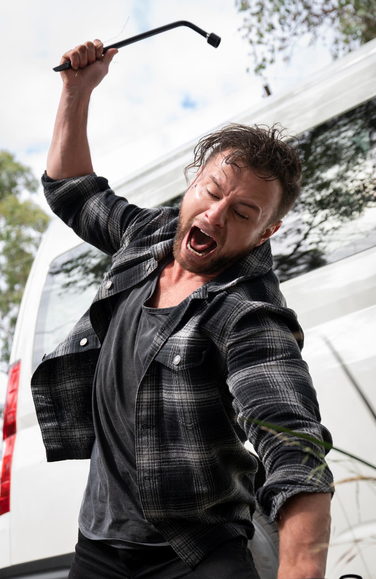 Wielding a tyre wrench, Gareth brutally attacks Aaron.