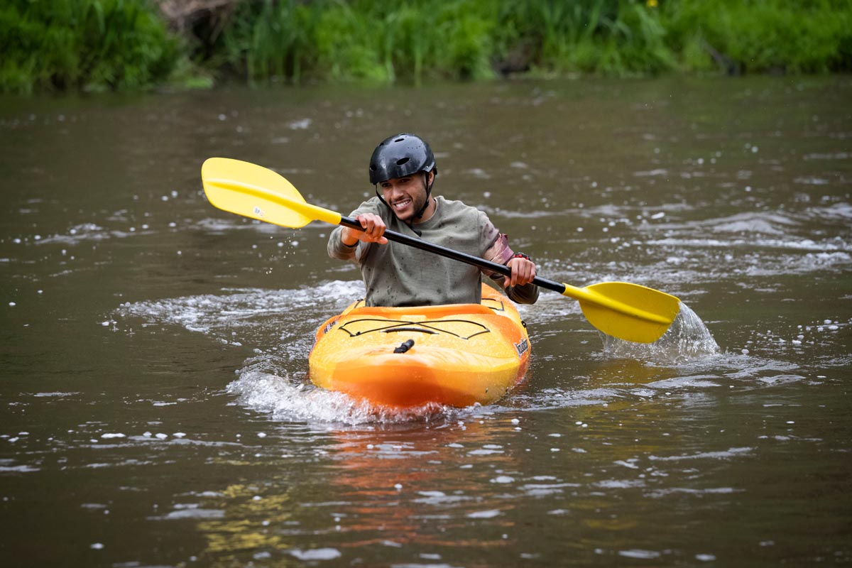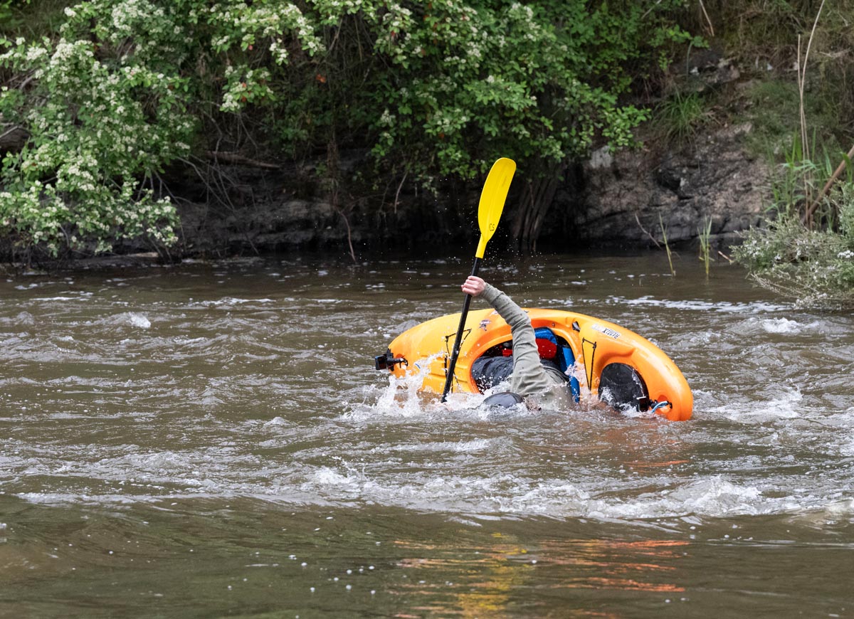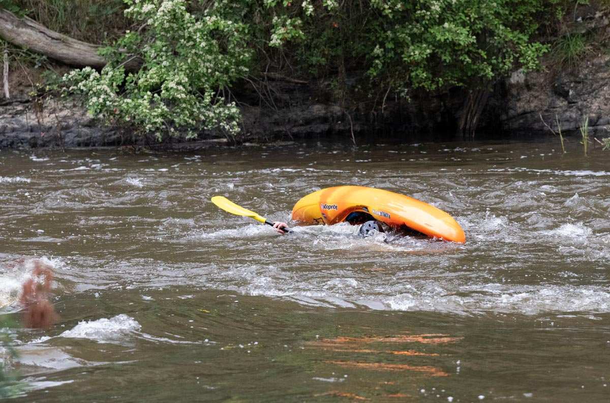 Although he gallantly attempts to stay afloat, the water becomes too much and his kayak tips, sending him headfirst into the murky waters below.