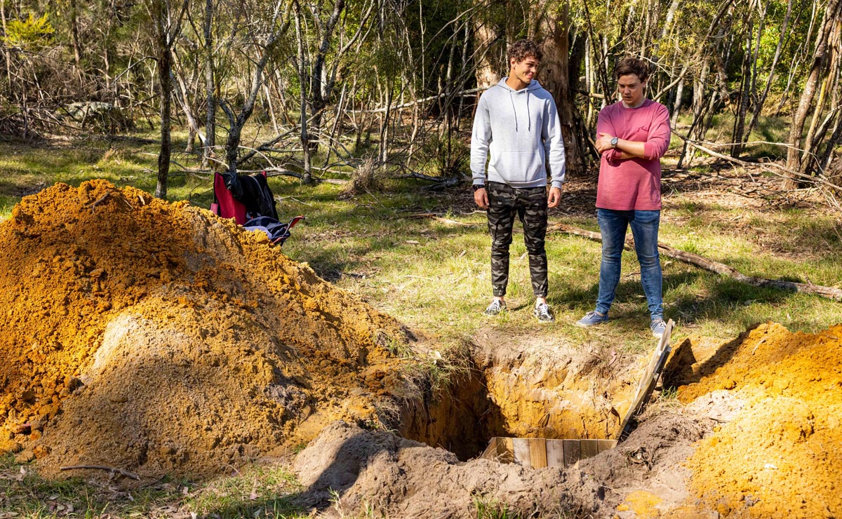 Thankfully, Roo recognises the location of the challenge as a patch of land near the caravan park, and she and Justin race over there and find a distraught Theo. He urges them not worry about him but to find Ryder—who must surely be out of oxygen by now!
