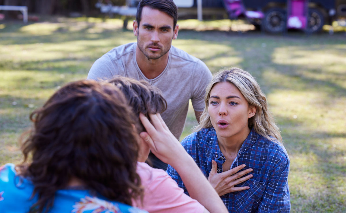 When Roo calls for help from anyone in the caravan park, Jasmine (Sam Frost) is luckily nearby with Cash (Nicholas Cartwright), and they both come running over to assist.