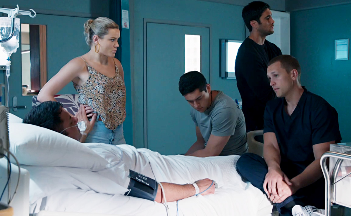 As the paramedics hand Ari over to Logan and Nurse Freya (Francisca Braithwaite), Mia, Tane and Nik are forced to wait outside until Officer Martinez (Shameer Birges) is able to verify their IDs.