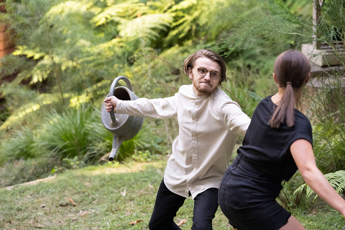 He grabs her and hits her across the head with a watering can, as a woozy Harlow dances on obliviously.