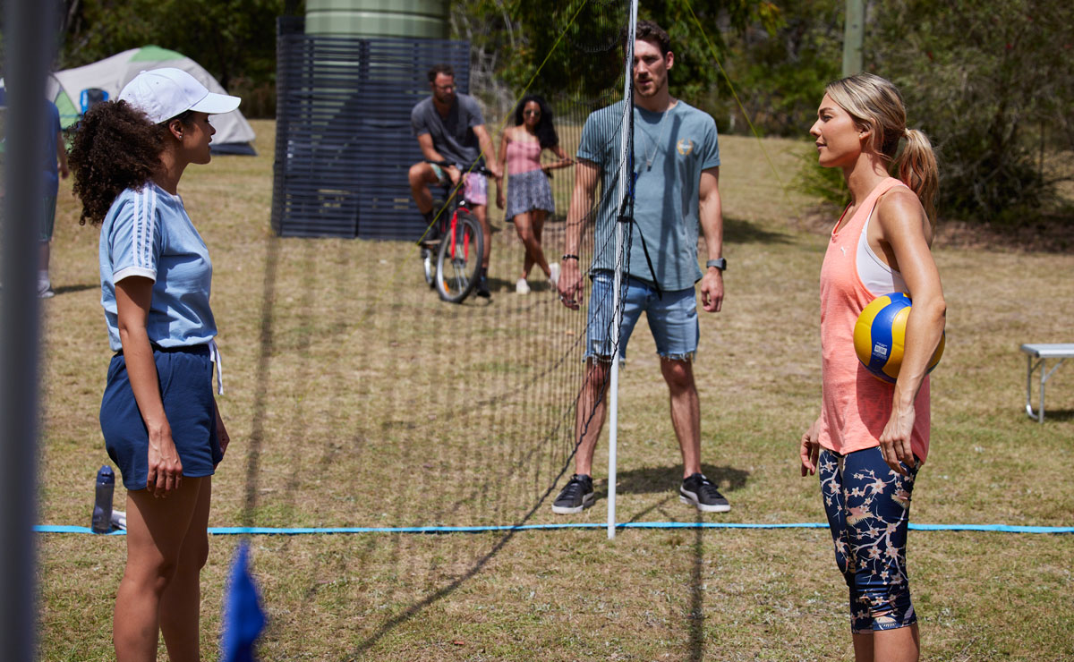 Inviting Jasmine and Rose to play volleyball at the caravan park, they’re surprised to find that they are going to be playing each other; Xander is merely umpiring.