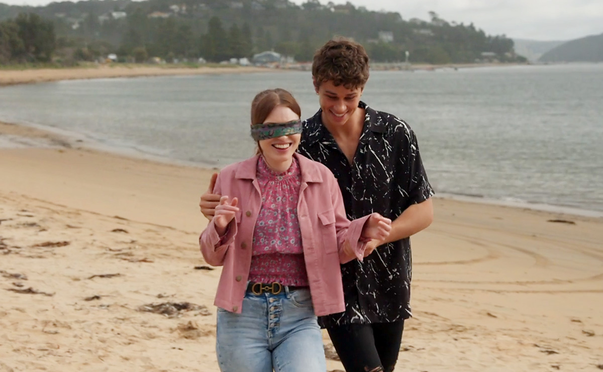 Theo blindfolds Chloe and leads her to a surprise picnic at the secluded end of the beach, a pop-up luxury getaway.