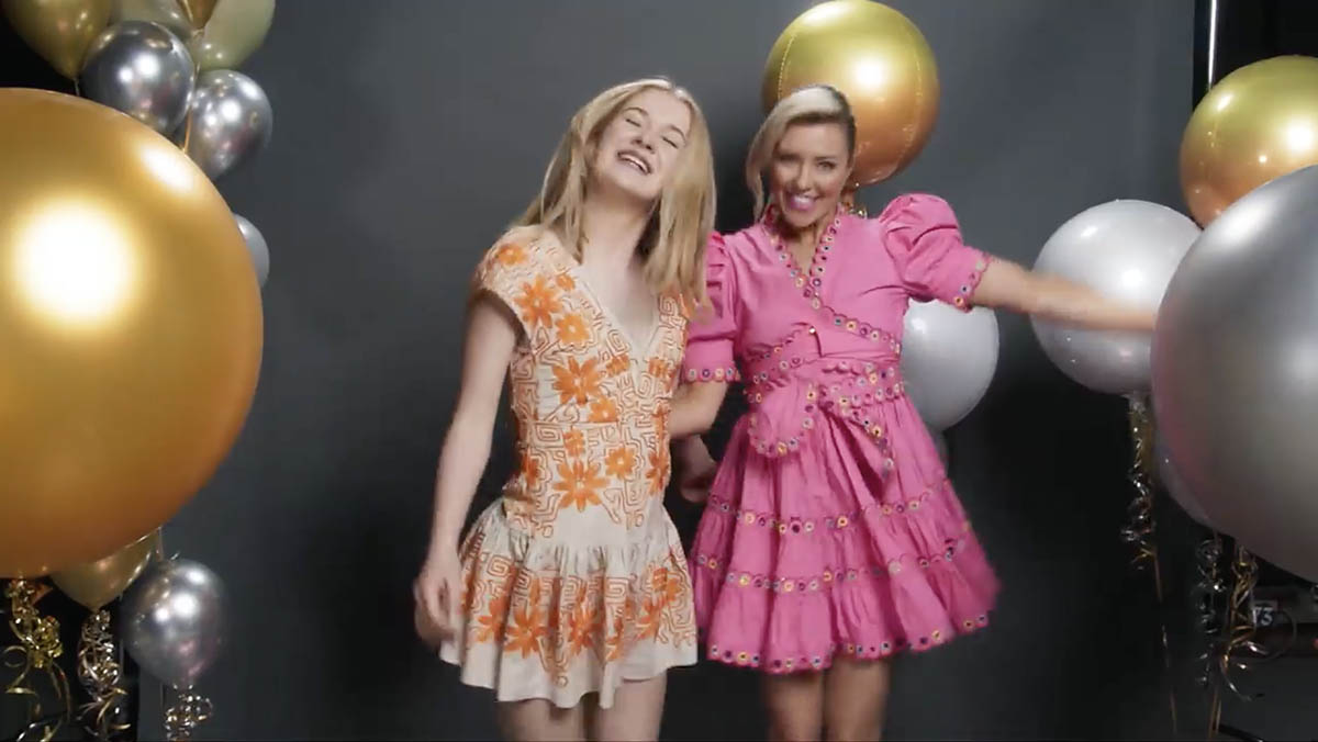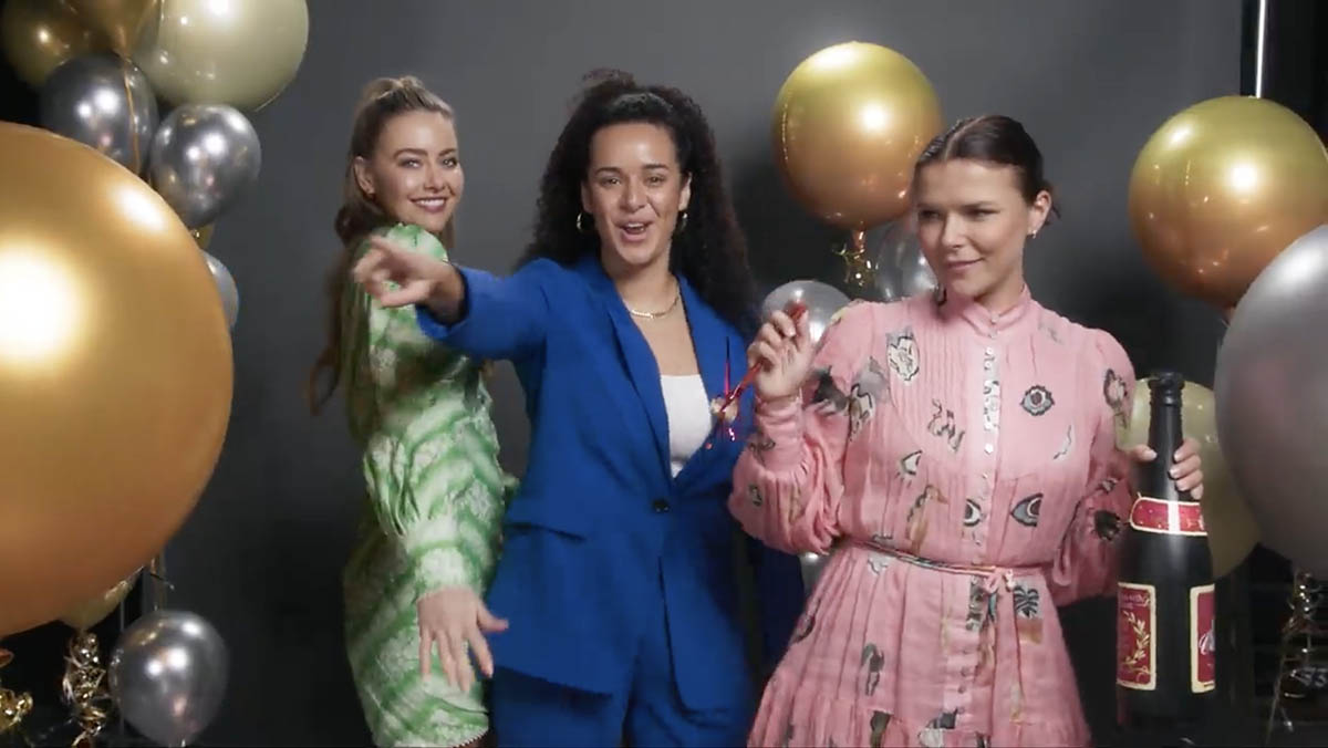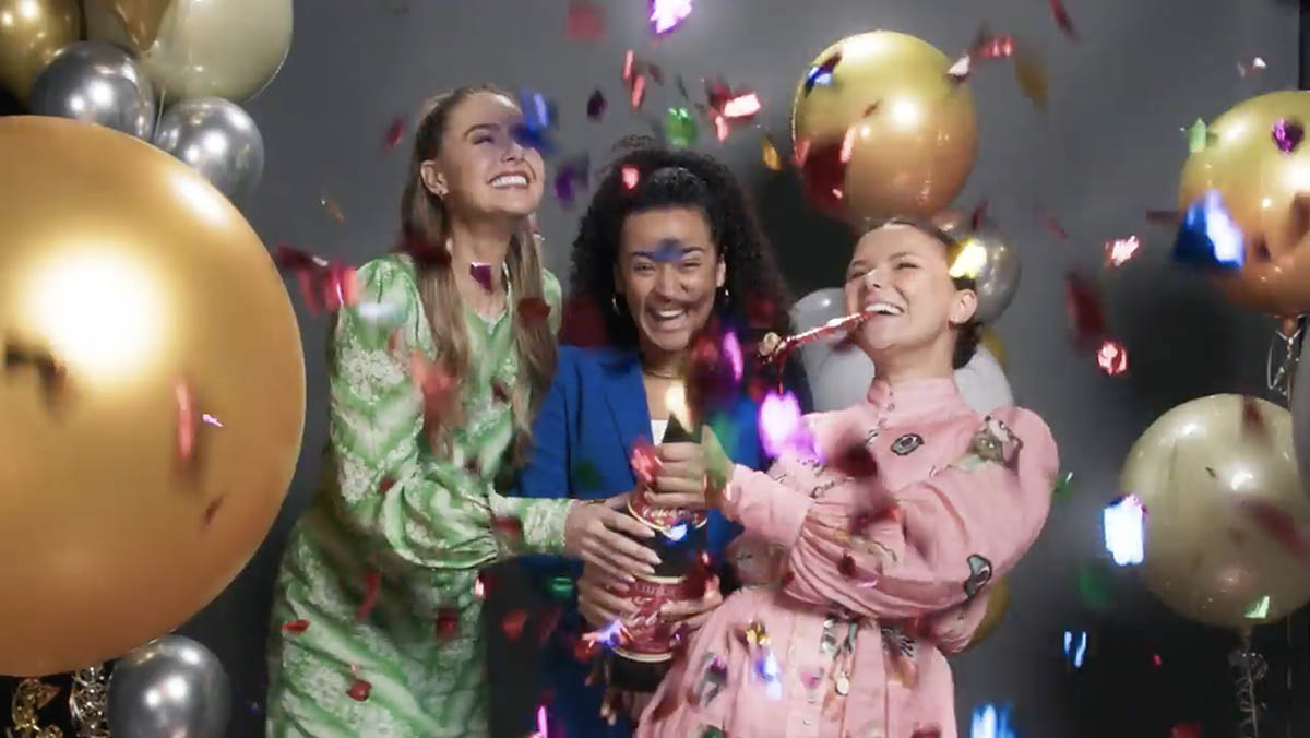 The residents of Number 24 – Chloe (April Rose Pengilly), Kiri and Freya (Phoebe Roberts) – look glamourous as they celebrate with an oversized bottle of champagne.