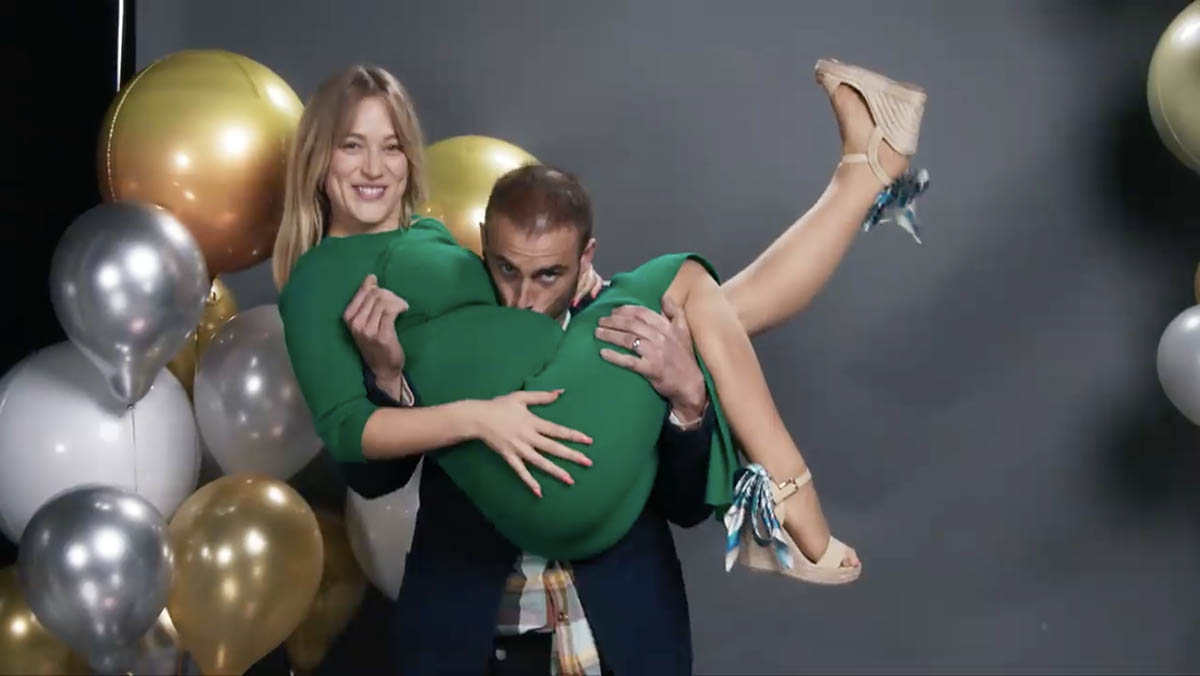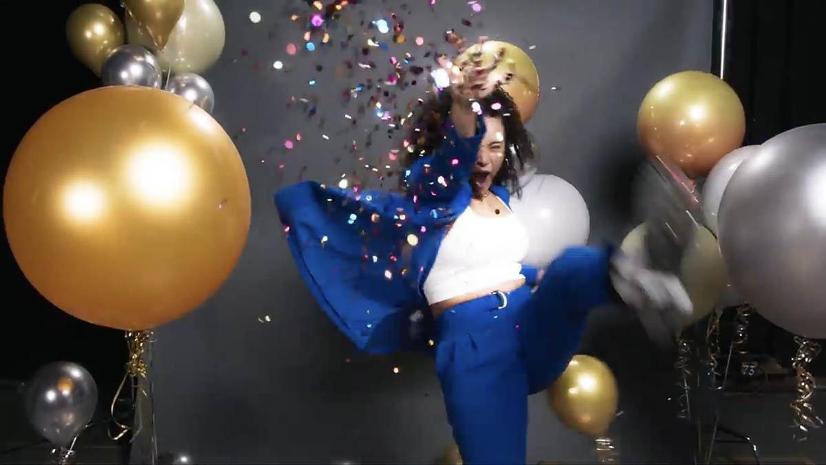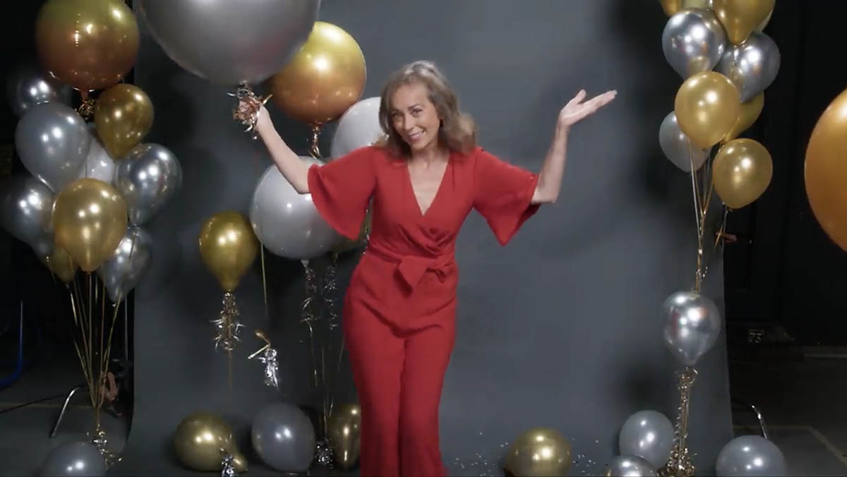 Jane has an outfit change for the second shot, donning a red jumpsuit while holding a giant silver balloon.