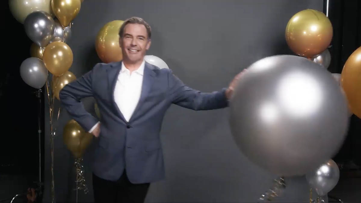 Shane Ramsay (Peter O’Brien) is back, and he’s seen in the clip blowing a party horn into the ear of Paul Robinson (Stefan Dennis).