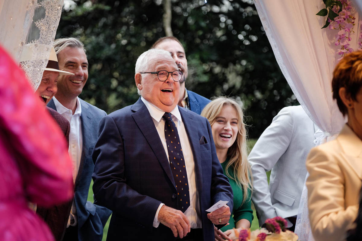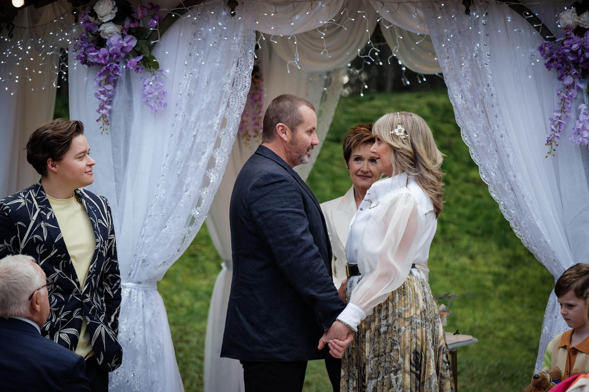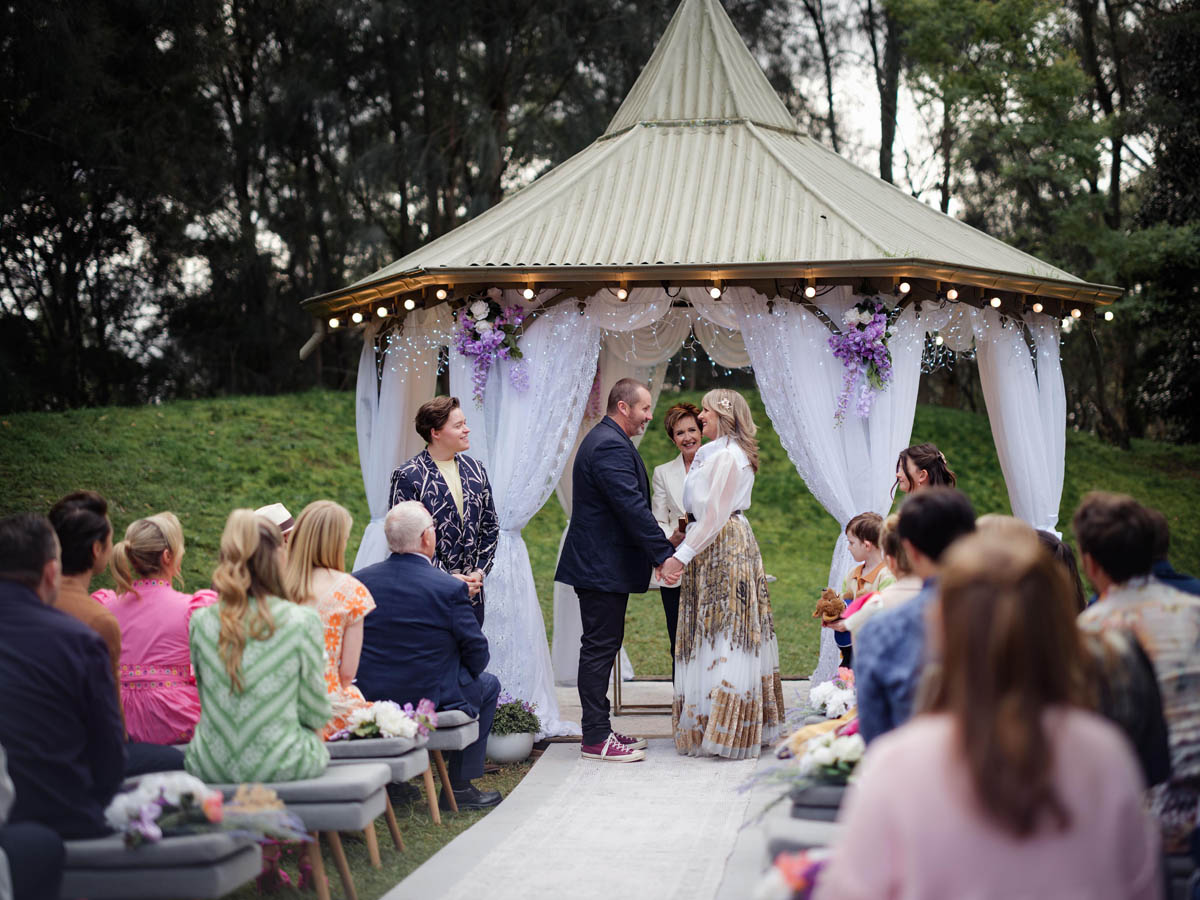It’s a beautiful, stripped-back ceremony at Lassiters lake, and the rotunda is decorated with fairy lights, flowers and lace netting.