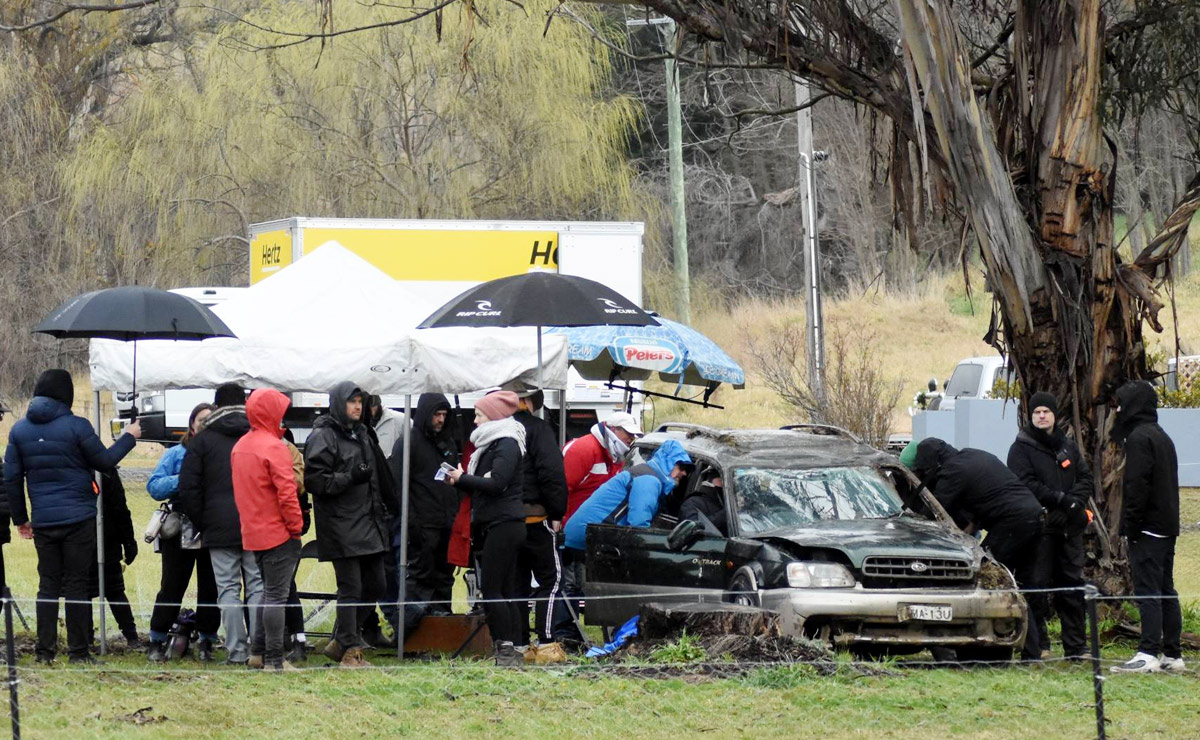 Photos taken from the shoot show Leah Patterson’s (Ada Nicodemou) crashed car resting underneath a tree, surrounded by crew members.