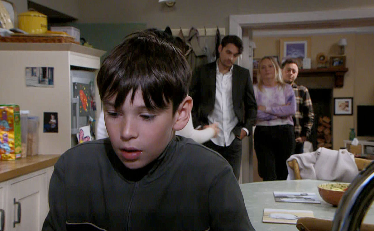 It became clear that Kyle (Huey Quinn) had been deeply affected by the day’s events, which was put down to seeing his father dragged away by armed police. The youngster had begun wetting the bed, and has been desperate to talk to Cain.