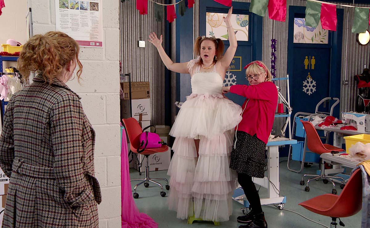 When Beth (Lisa George) agrees to make some adjustments to the dress, Gemma models it for her as she goes about pinning… only for Fiz to walk in on them!