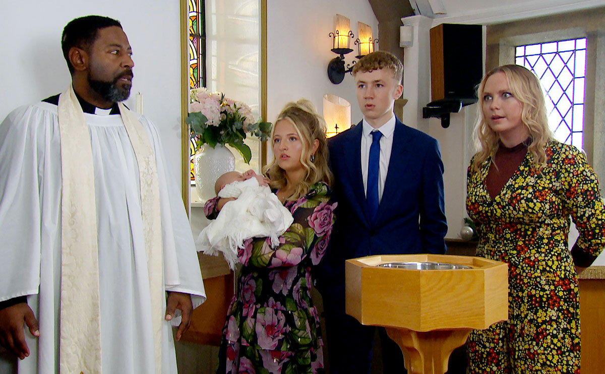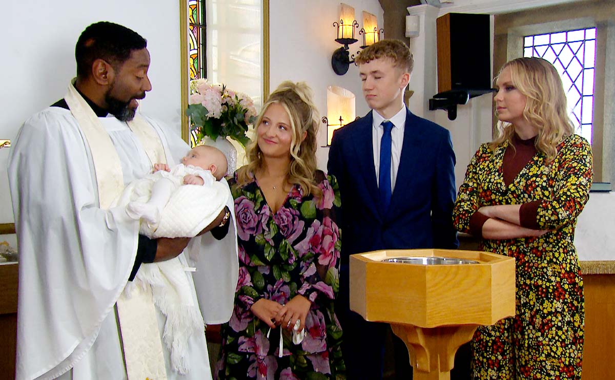At St Mary’s Church, Charity isn’t impressed when Chloe and Amy arrive for the christening, having been invited by Chas.