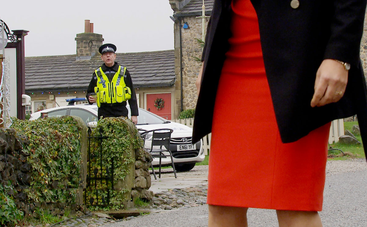 The feud continues outside, having become physical, and it’s unfortunate timing when PC Mike Swirling (Andy Moore) just happens to be coming out of the cafe with a beverage when he witnesses the ladies scrapping in the middle of Main Street.