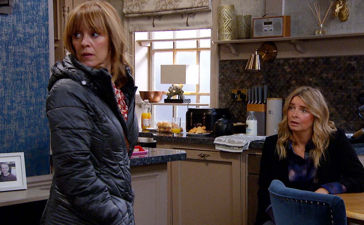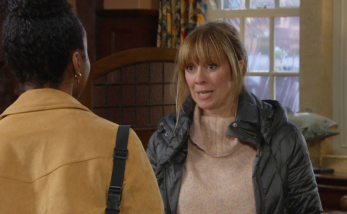 Rhona confronts Naomi in The Woolpack, and when the argument turns physical, Rhona ends up sprawled on the floor! Rhona looks to her husband for backup, but is fuming when Marlon (Mark Charnock) refuses to take her side.