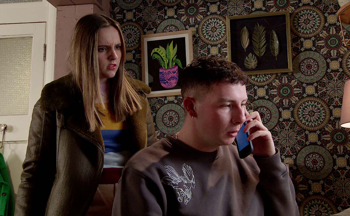 Back at the flat, panicked Jacob was in the process of trying to send an apologetic goodbye text to Amy when she came home unexpectedly. Forced to make a split-second decision, Jacob pretended he was on the phone trying to score some drugs to sell on.