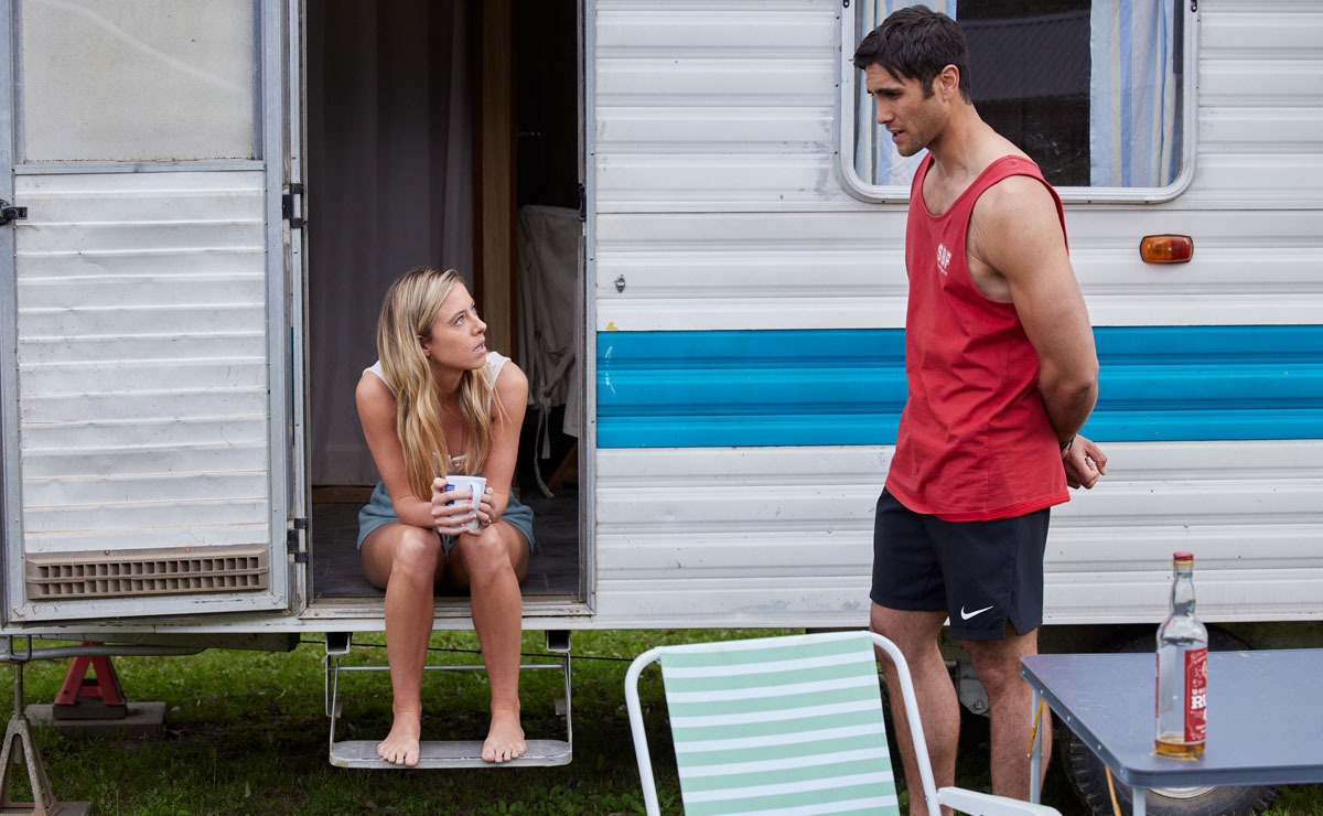 Tane’s heard from Mackenzie (Emily Weir) about the incident at Salt last night, where Flick took issue with Gabe (Akos Armont) refusing to allow her to serve drinks whilst intoxicated, and pulled the power on Lyrik’s gig as she stormed out.