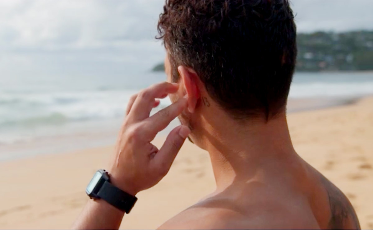 Atop his surfboard, he puts his finger to his ear – just adjusting his earplug, or has the dizziness already begun?