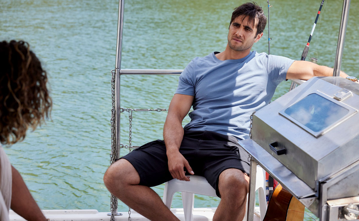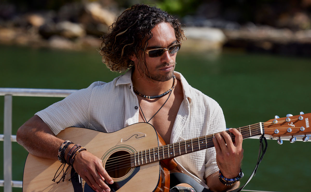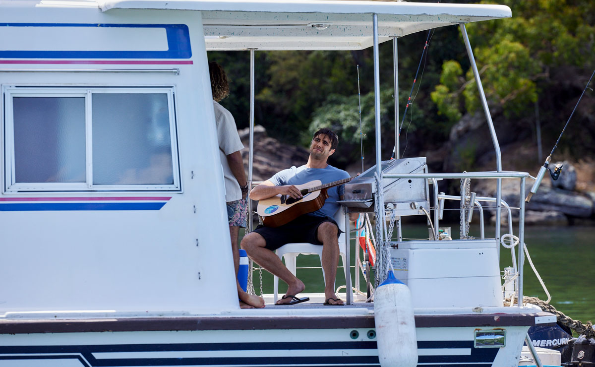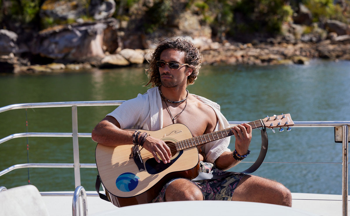 Some distance from Summer Bay, Kahu is living the dream as he strums away on his guitar whilst moored up off a secluded beach.