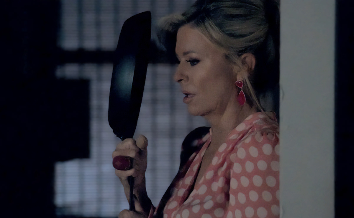 Grabbing a nearby frying pan, that is handily sitting on the side in the downstairs bedroom, a terrified Marilyn creeps back towards the living room.