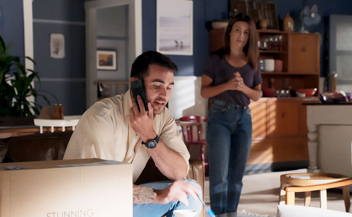 Once again the box sits prominently on the coffee table in the living room (who needs a fruit bowl?), and remains there all night as Leah and Cash (Nicholas Cartwright) worry about their next moves with a missing Justin (James Stewart).