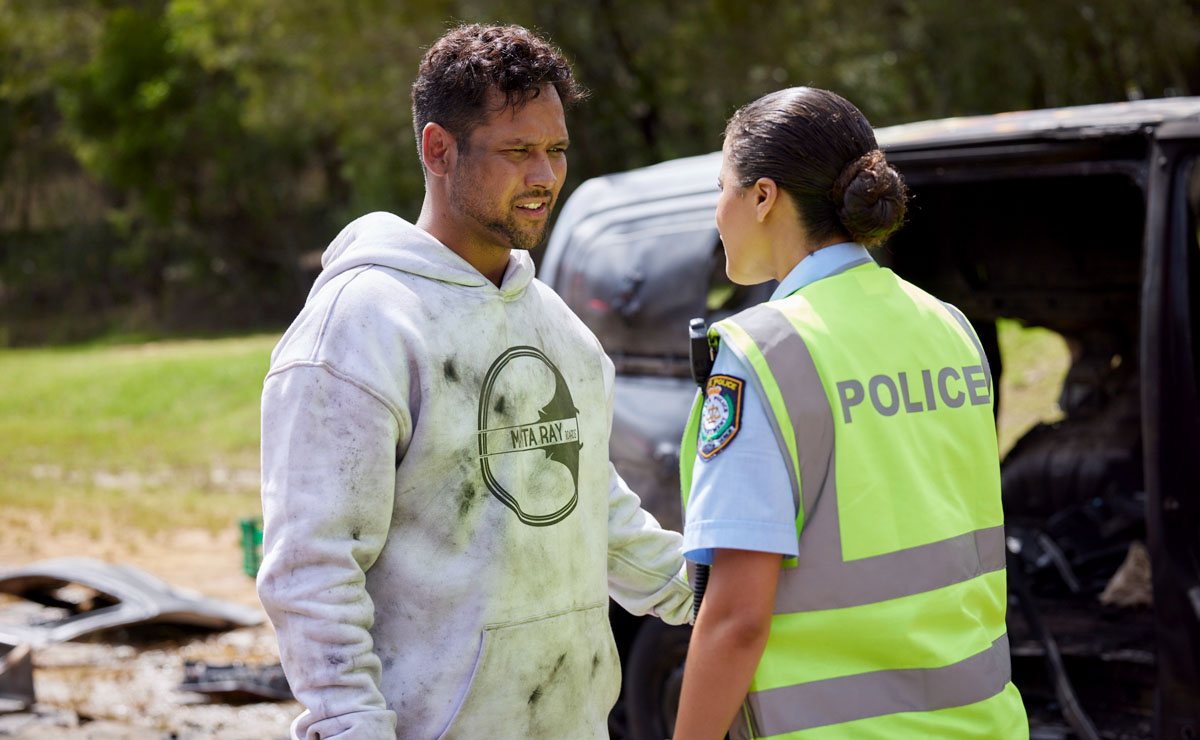 The blaze has been put out by the time Cash (Nicholas Cartwright) and Rose (Kirsty Marillier) appear on the scene, shocked at the carnage in front of them.