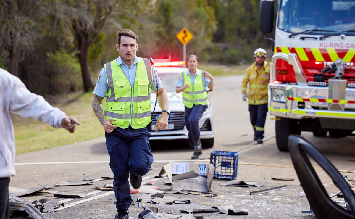 John is being treated by paramedic Carla (Jennifer Rani) for a pain in his abdomen, but he’s more concerned that they look after Roo who is already being loaded into an ambulance.