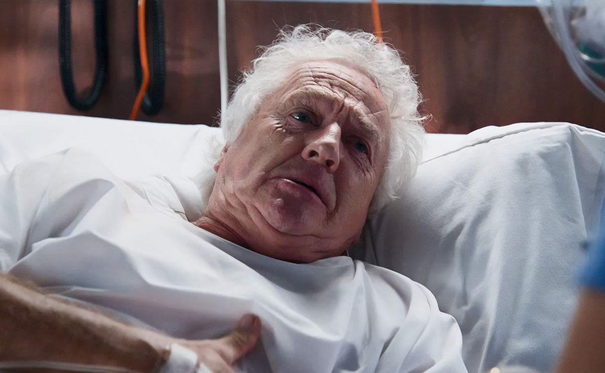 As John thanks Irene for staying with him, he suddenly clutches his chest in agony as he collapses back onto the bed.