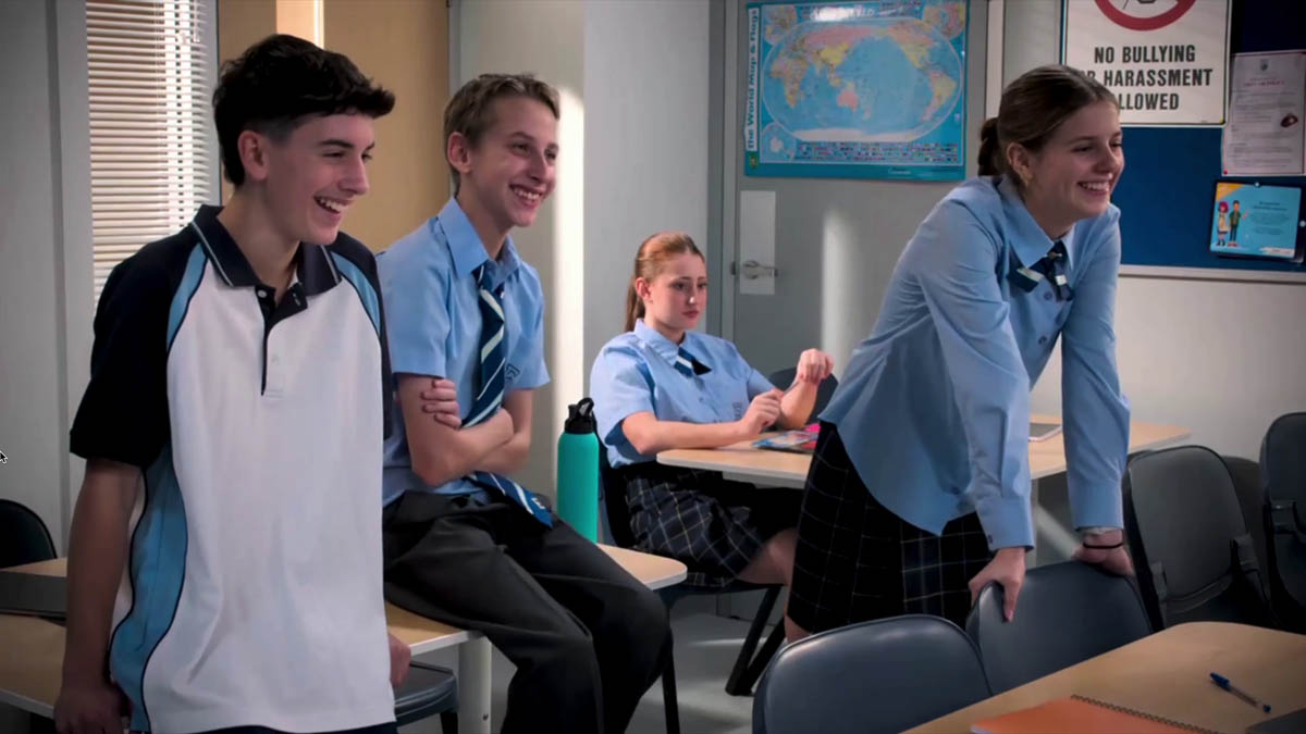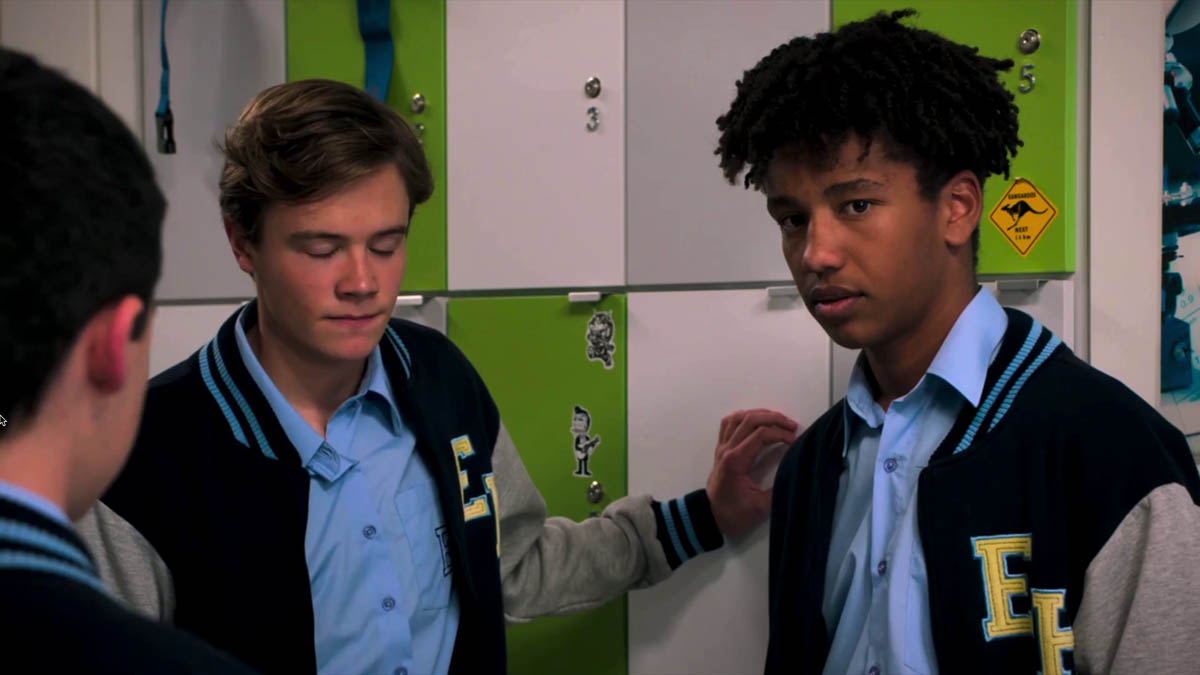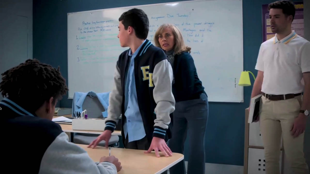 Later in the day, Jane (Annie Jones) and Curtis (Nathan Borg) head into class, discussing their plan to save Erinsborough High, where they catch Noah jibing at Dex for having two mothers. Jane is furious and orders him to her office immediately.