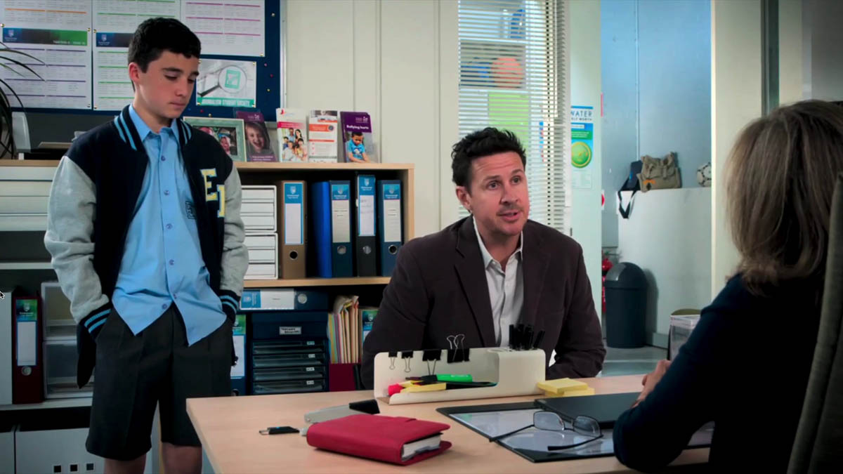 Cara and Remi are called, and are grateful for Jane’s zero-tolerance policy towards Noah’s behaviour. Immediately following their departure, Noah enters Jane’s office with his father Pete (Gabriel Egan), who is appalled by his son’s behaviour. He assures Jane that he will hold him accountable.