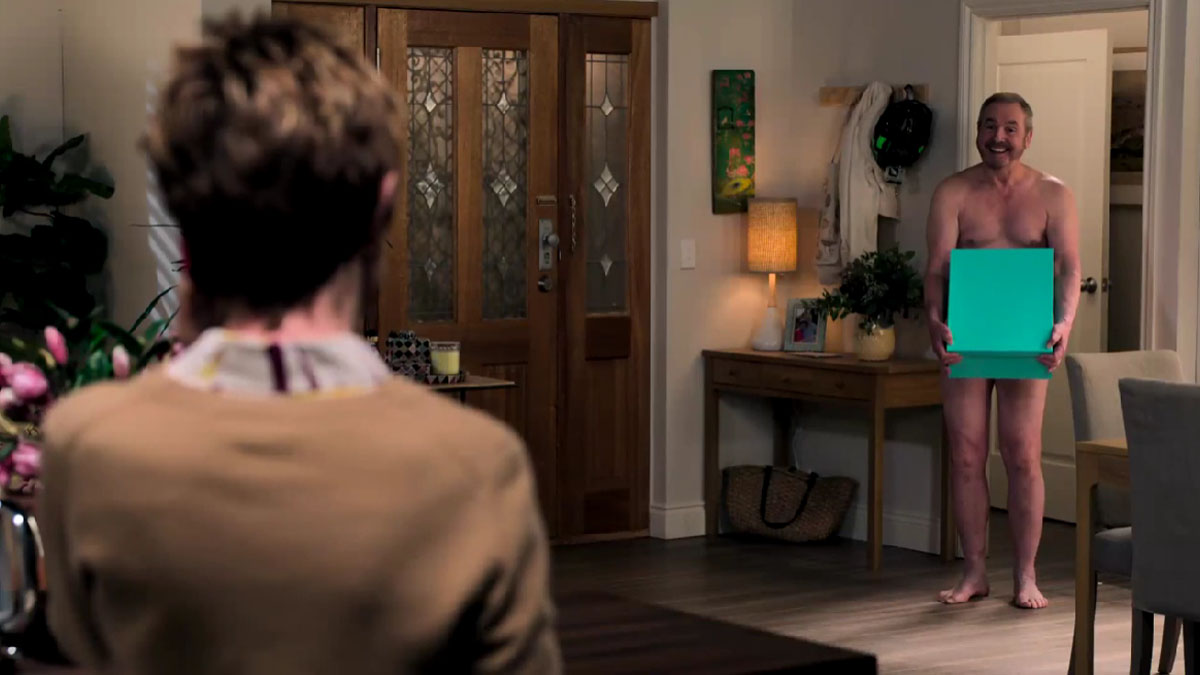 However, with a pepper in hand, she turns and finds him standing starkers in the living room, their famous blue box strategically placed.