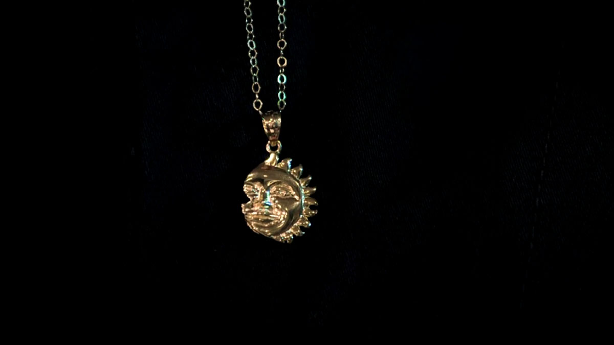 One of the employees is holding a necklace, with a gold sun pendant attached to it.