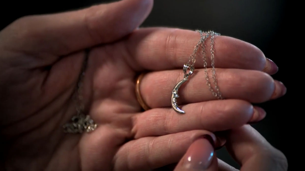 She removes the top compartment and retrieves a necklace, hidden away. It’s silver, with a matching pendant – the only difference, it’s a moon.