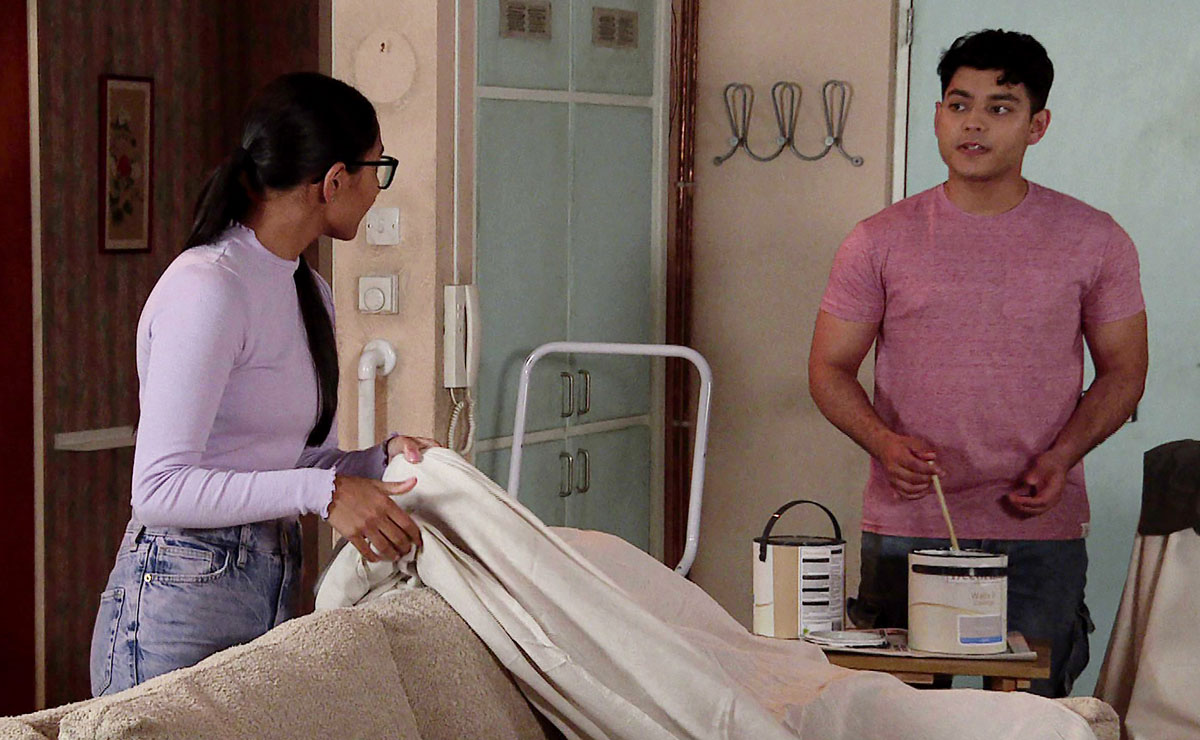 Meeting up with Asha (Tanisha Gorey) to apologise for the recent spat, Asha suggests they give the flat a lick of paint to brighten things up a bit.