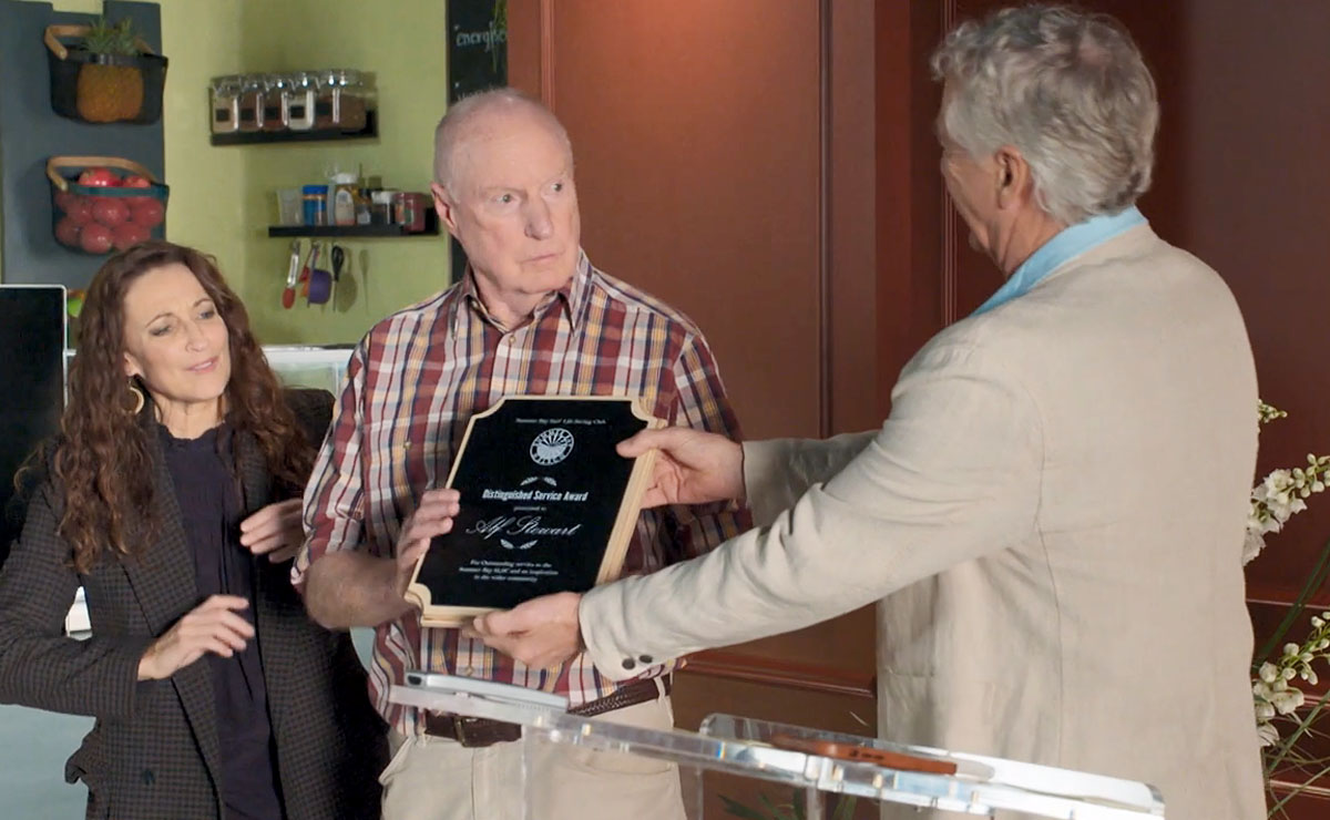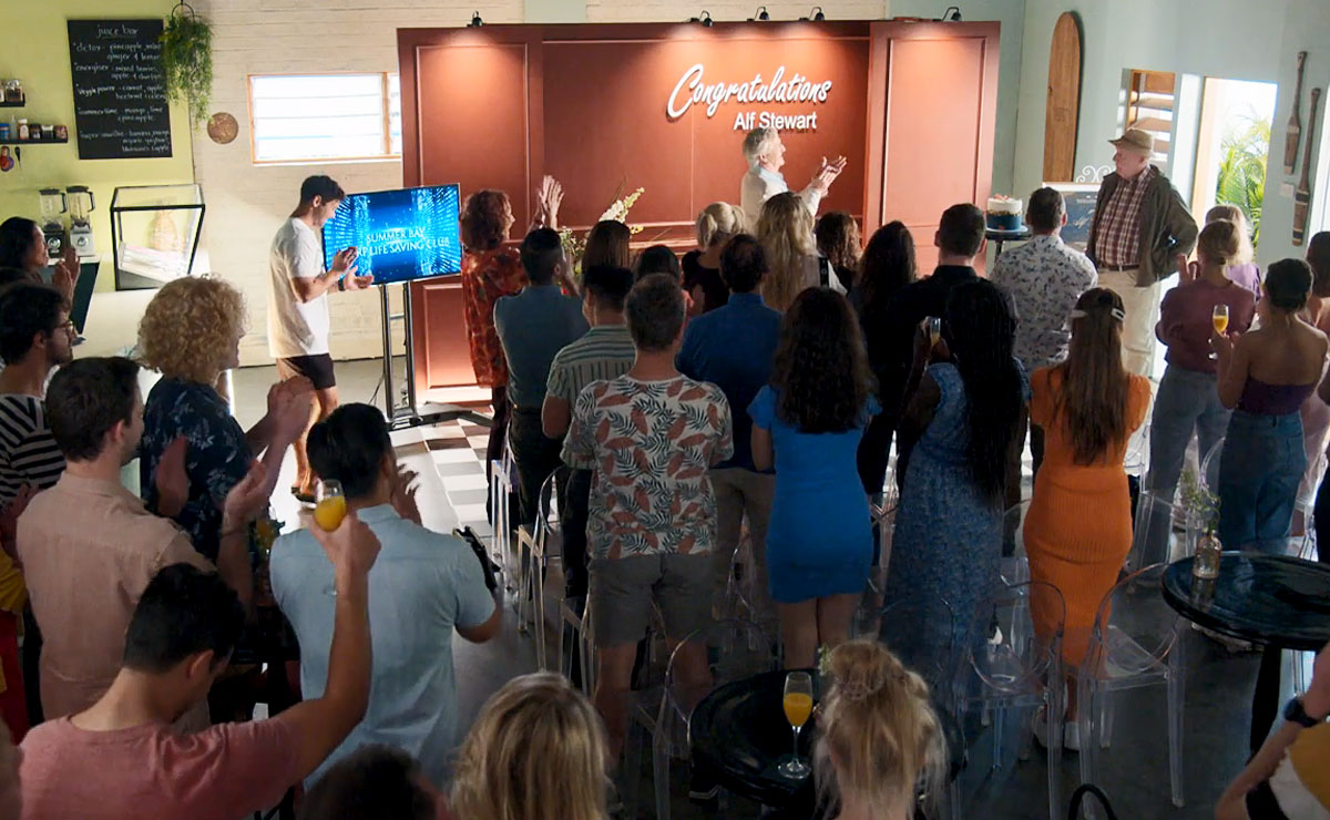 As a proud Marilyn, Roo, Irene and Leah (Ada Nicodemou) look on, a video slideshow is played, and Alf is presented both with a plaque and a tailored jacket sporting the surf club logo.