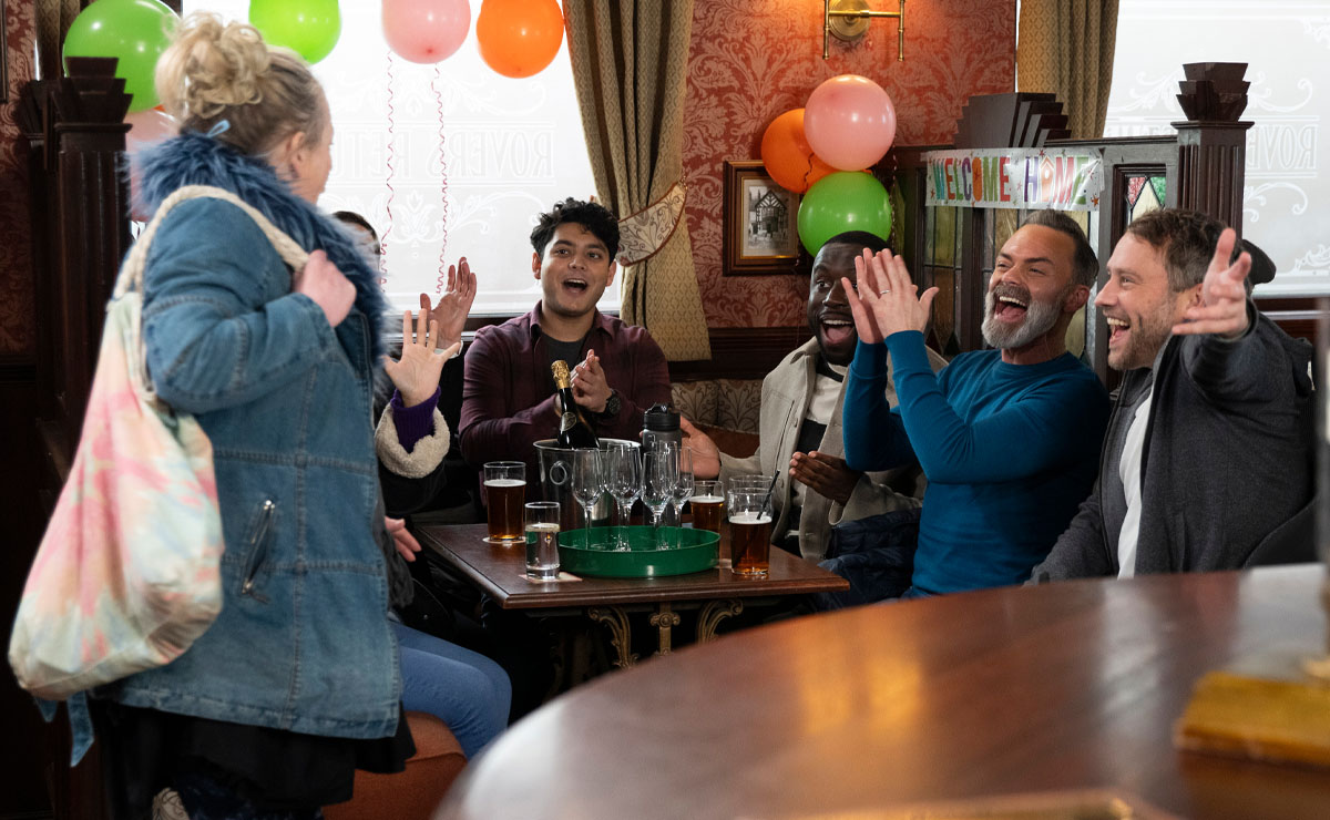 On her return to the street, Bernie calls in at the Rovers and is shocked to find Dev (Jimmi Harkishin), Paul and Billy (Daniel Brocklebank) have thrown a surprise coming home party.